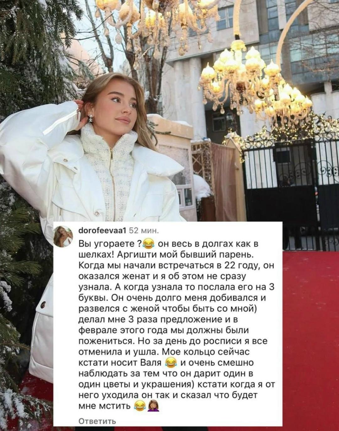 «Когда мы начали встречаться в 22 году, он оказался женат и я об этом не сразу узнала. А когда узнала то послала его на 3 буквы. Он очень долго меня добивался и развелся с женой чтобы быть со мной) делал мне 3 раза предложение и в феврале этого года мы должны были пожениться. Но за день до росписи я все отменила и ушла. Мое кольцо сейчас кстати носит Валя», — написала Юля.