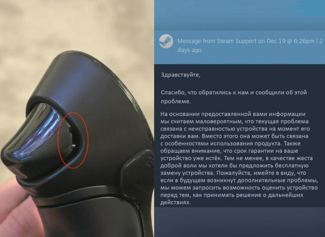 Один геймер решил написать в поддержку Valve, приложив фото сломанного триггера от VR-контроллера Valve Index.