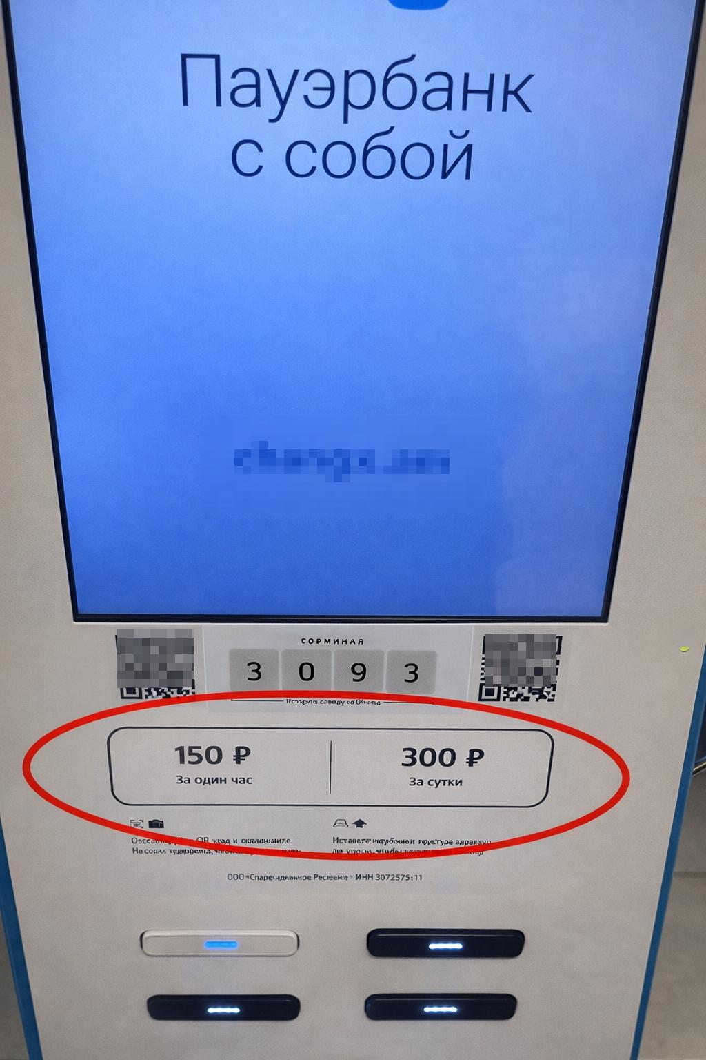 Рядом стоит платный раздатник повербанков — 150₽ за час, 300₽ за сутки, всё по-взрослому. А ниже — действия человека, который посмотрел на это, подумал и воткнул свою зарядку прямо в розетку, из которой питается сам аппарат.