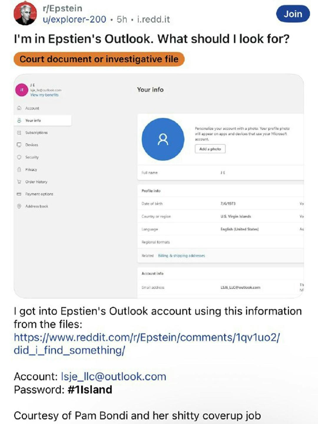 Файлы Джеффри Эпштейна преподнесли сюрприз, которого никто не ждал от судебных архивов. Пользователь Reddit обнаружил в документах данные активной подписки Microsoft 365, привязанной к аккаунту покойного миллиардера. Но вишенкой на торте стал пароль — «#1 island» (остров №1).