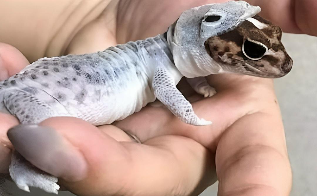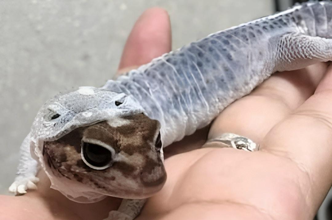Леопардовый геккон сбрасывает свою шкуру. А выглядит так, как будто у него симпатичная толстовка с капюшоном.