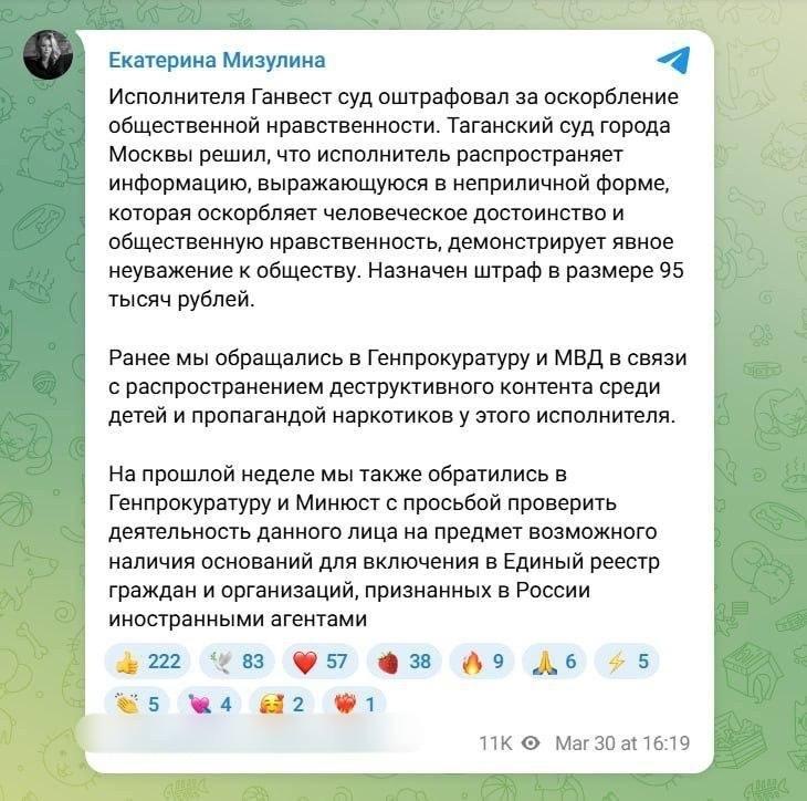 Екатерина Мизулина, возглавляющая Лигу безопасного интернета, направила обращения в Генпрокуратуру и Минюст с просьбой рассмотреть возможность внесения рэпера Ганвеста в список иностранных агентов.