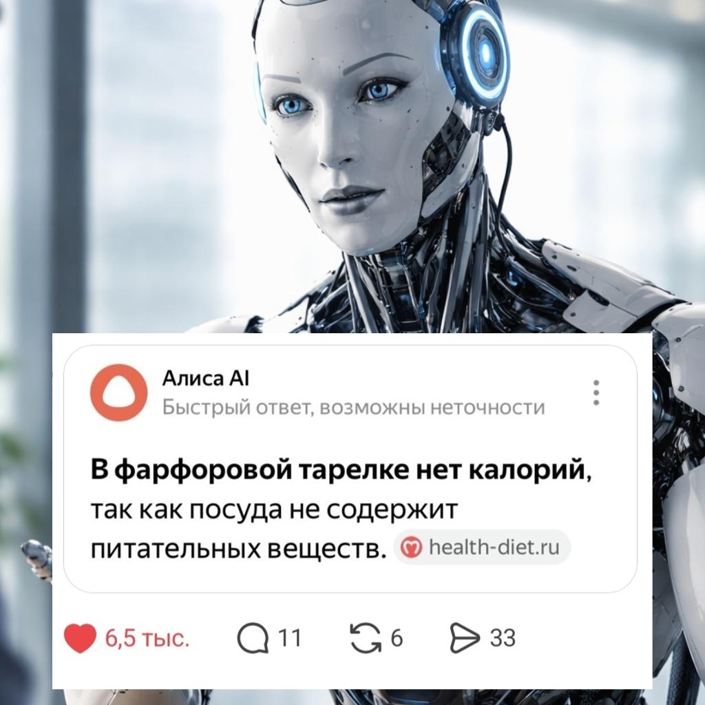 Но будущее внезапно дало заднюю. ИИ посмотрел на снимок, собрал весь свой цифровой интеллект и выдал: «В фарфоровой тарелке нет калорий, так как посуда не содержит питательных веществ». Всё. Не еда, а тарелка. Не диета, а керамический ...из.